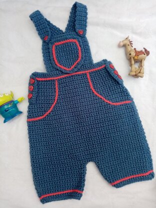 Surface crochet in contrasting yarn gives the dungarees a denim inspired look.