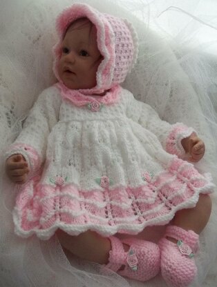 If you are looking to knit a handmade gift for a new baby girl or perhaps you are a collector of life-size reborn baby dolls this pretty dress, bonnet and shoes will fit the mark.