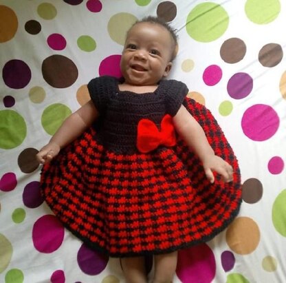 This baby dress is made using the basic stitches with two colors of yarn. Materials needed include: