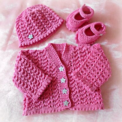 Emily is a pretty DK pattern to knit a hat, cardigan, and shoes. The set is knitted flat on two needles using dk yarn. The pattern is written using standard UK terms.