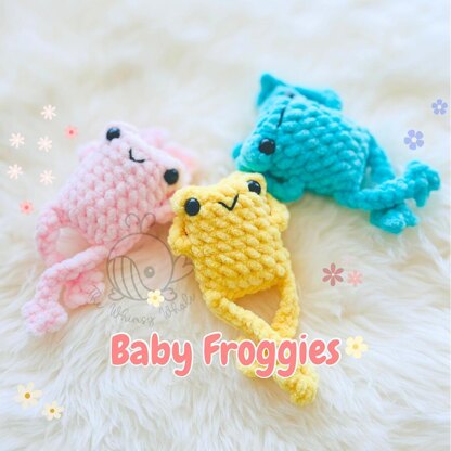 Baby Froggie is a super popular plush at markets, you cannot make only one! These Baby Flaily Froggies have squeezable torsos and adorably flaily limbs, they always look like they’re having fun together! You’ll find each one you make demands its own personality! This pattern includes how to make the 3 expressions you see in the pictures (deadpan, cheeky smile, rounded smile).