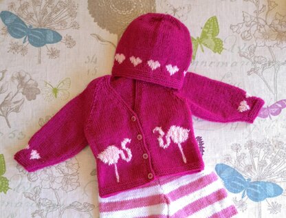Flamingos are knitted on each of the jacket fronts and also 2 on the back with hearts on the sleeves and around the hat brim.