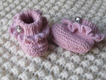 Very simple and cute booties for a baby girl! The pattern is available in three sizes from 0 to 9 months. The booties are knitted on straight needles and have a seam. The ruffle is crocheted.