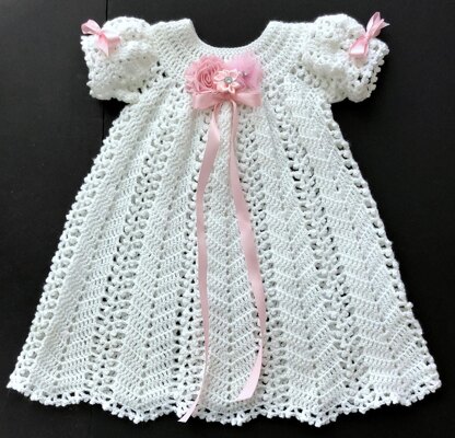This christening dress crochet pattern is designed to fit a 4-6 month infant. It features the traditional look of lace, puffed sleeves, and ribbons tied in bows. It can also be made as a short special occasion/everyday dress. A printable slip patter, with instructions, is includedl