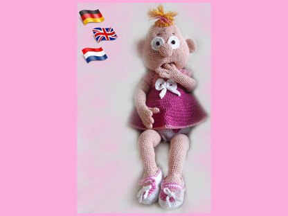 * Simple pattern if you know how to crochet Magic Ring, chain , slip stitch, single crochet, half double crochet and double crochet. * This manual is available in English, Dutch and German. * The Doll is 50 cm (hook size 3). * The manual is very detailed and contains many photos.* If you have any problems and / or questions about my instructions please contact me by email. Attention! This is a crochet pattern, not a finished product