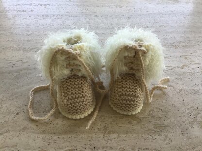 Adorable Baby Faux Fur Booties - Made In One Piece Working From The Sole Upwards on Two Needles. This Pattern Makes Three Sizes Pre Walkers 0 to 3, 3 to 6 and 6 to 12 months.