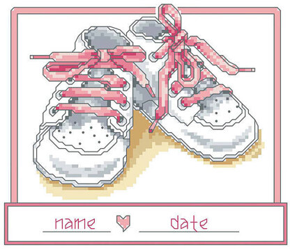 Designed by: Linda Gillum. Share the joy in the pitter-patter of new little feet with this cross stitch nursery art featuring a pair of pink baby booties. This newborn gift can be personalized with the baby’s name and birth date. Makes a truly thoughtful gift for baby showers, new babies, “gender reveal” parties, baptisms, first birthdays, and holidays. A quick stitch to make for any new baby.\n