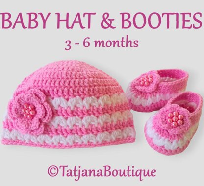 Crochet pattern baby hat and ballerina booties decorated with crochet flowers and pearl beads. ♥♥♥ Size in this pattern 3 - 6 MONTHS.