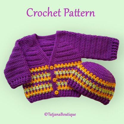 ♥ Crochet pattern baby cardigan and hat ♥ Size in this pattern 3 - 6 MONTHS. The pattern is written in US crochet terms but with a conversion at the beginning of the pattern to UK / Australian terms. Its just that some of the names of the stitches are different. Materials & tools you will need: ★ Acrylic or other yarn 150 gr approx. - DK, Double Knitting in UK, Light Worsted in the USA, 8ply in Australia. ★ Crochet hook size recommended 5 mm. ★ 3 buttons. ★ Yarn needle to weave in ends (optional).