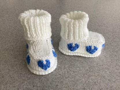 Quick And Easy Baby Heart Booties - Pattern Makes 3 Sizes. Knittied in one piece from the sole to the top of the booties. Made on two needles with back seam.