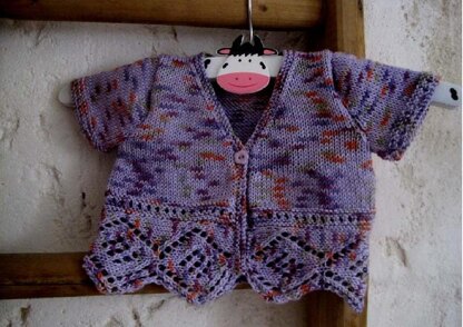 A gorgeous cardigan knit in one piece to armholes from stitches which are picked up from a separate lace border. the lace threaded through the eyelets is optional