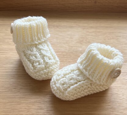 These cute mock cable booties are suitable for a beginner knitter, who know the basic knitting stitches, to a more experienced knitter. Easy and quick to knit with an easy to follow row-by-row knitting pattern. Knitted in DK yarn, you will need 3.25 mm (US 3) and 3.75 mm (US 5) knitting needles. These booties are knitted flat and seamed afterwards. Matching bonnet pattern available in my shop