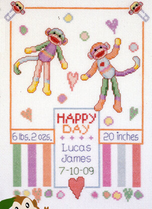 Designed by: Linda Gillum. Baby Monkey Sampler Have a lovely permanent record of your baby's birth. These cheerful monkeys will announce it to the world!\n