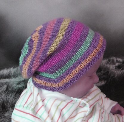 This is my Baby Multi Coloured Stripe Slouch Hat knitting pattern.The pattern provides full instructions for 4 sizes so can be made for any baby from preemies to toddlers with a head circumference between 12-20 inches. Its knitted on 4 mm needles and you can choose any dk yarn so its great for using up leftovers.