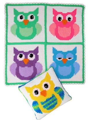 Made using easy-to-crochet squares in single crochet following color-change graphs. Blankie is 34" x 34", and the pillow fits standard 16" pillow form. Uses worsted-weight yarns.