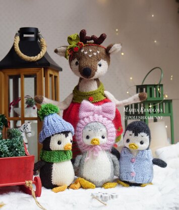 Knitting Baby Penguin Toy pattern by Mariia Ermolova Polushkabunny ♥Pattern includes: baby penguin toy + two cozy hats with pom-pom and bow + little snood