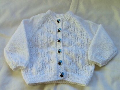 All over small lace pattern. Sleeves are knitted first, then the body is knitted in one piece to the armholes,when the sleeves are added and the yoke is knitted in one piece. Sleeve seams and underarm seams are the only seams. Yarn quantities 0 to 3mths 70gm; 3 to 6mths 80gm; 6 to 9mths 90gm; 9 to 12mths 100gm