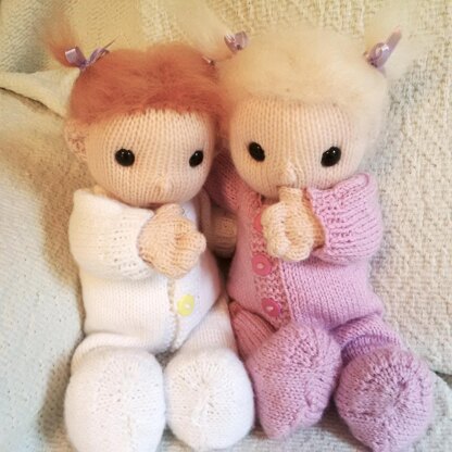 Baby Poppet is knitted flat and assembled. The legs, body and head are knitted as one piece, then a simple seam is sewn from inside leg to outer hip to form the hip joints, this makes the legs nice and floppy and a very huggable doll.
