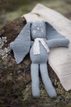 A fun knit toy rabbit, embroidered face and garter stitch ears.