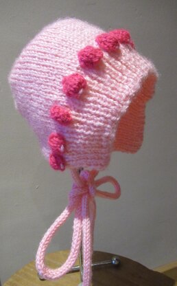A lovely little bonnet for spring, with rosebuds around the rim. Knitted in soft DK, it's ideal for those first precious months