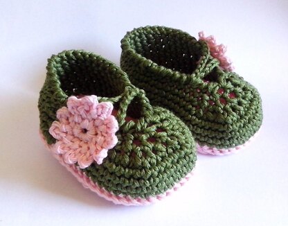 Crochet Baby Green Shoes with Pink Flower / Booties /Slippers/ PDF Pattern 905/ Tutorial / Instant Download /Permission to sell finished items.