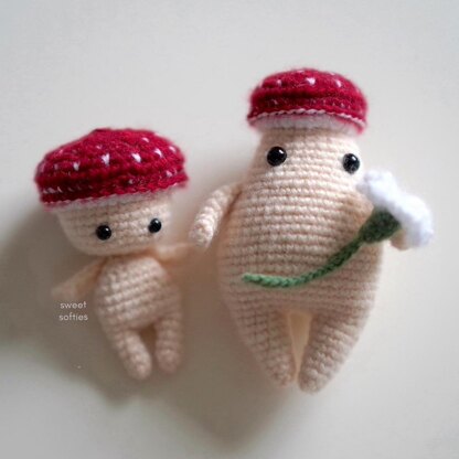 The Baby Toadstool and Mister Mushroom patterns are a 2-in-1 combo pack. These two clever amigurumis are made almost completely in one piece. Their nearly no-sew design requires sewing for only the two arms. Both mushrooms have white speckles on their red cap surfaces. The Baby Toadstool has an adorable chibi body shape that fits perfectly in a palm for extra cuteness, while Mr. Mushroom has a more chubby, fungi shape. This project comes with a sweet flower pattern too! Crochet this miniature set as a sweet gift for fairytale and woodland lovers. It can be made into a keychain or charm, and is easily customizable with different yarn colors and appliques.