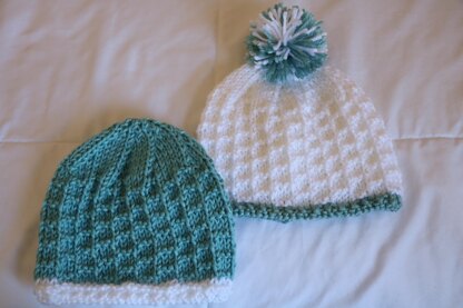 Pattern is written in English standard US terms. Baby Textured Hats.Girls,Boys. Hats are hand-knitted with amazingly soft yarn.They are comfy and warm. Textured stitch adds some interest to fabric & makes the hats pretty.Matching Pattern "Ocean Reef Baby blanket" The pattern has easy to follow step-by-step instructions. The stitch is simple to work, only knit & purl. Level: Intermediate or beginner with good basic skills. Materials. Red Heart "Soft" yarn, weight # 4 Medium, 1 skein 5 oz / 141 gr, 256 y / 234.Colors: Rose blush, Seafoam, White. Circular or straight knitting needles US 7- 4.5 mm, US 6 -- 4 mm Yarn needle.