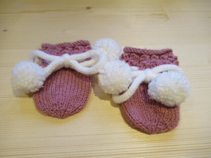 A pair of beautiful lacy topped mittens - perfect for those chilly days. Easy to knit in soft DK. The pattern is suitable for a more advanced beginner. Designed to go with lacy topped bootees and beanie, available as a combined pattern.