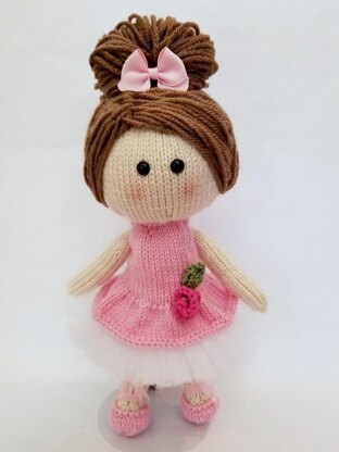 She is made with medium weight (4) yarn and US 3 (3.25mm) DPNs, which makes her approx. 13” tall when complete, but any weight yarn and correlating DPN size could be used. Just be sure to use the same size yarn for all parts of the doll so the clothing will fit correctly. She is knitted mostly in the round, head and limbs are sewn to the body. She has a basic construction that makes her easy and fun to make. The pattern is 11 pages long and includes photos and links to tutorials to assist you.