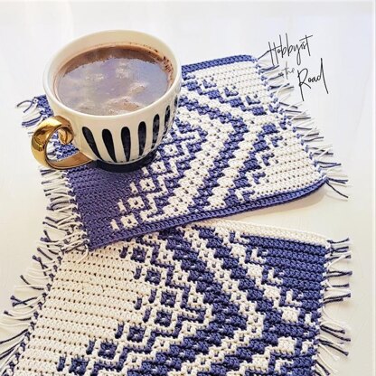 This is a crochet PDF pattern for a Baltic Vibes mug rug fulfilled in Mosaic Overly technique. The pattern includes Step-by-step How-to instructions, charts and close-up process pictures plus a very detailed tutorial for those who have never crocheted in Mosaic Overlay technique before.