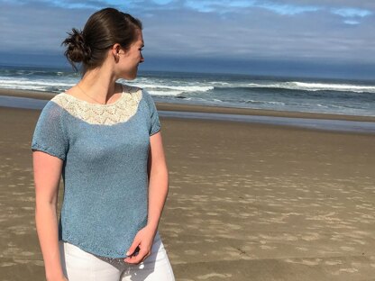 Bandon-by-the-Sea is a perfect top for warmer weather and to wear over jeans or shorts. The yoke lace is echoed in the gentle shirt-tail hemline and sleeve finishing. Choose either short sleeves as shown in sample photos or ¾ sleeve option included in instructions.
