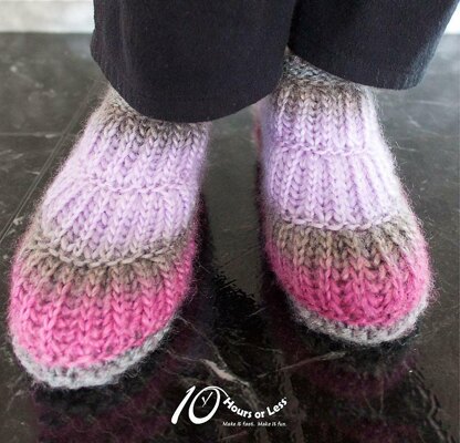 Turn your favorite self-striping into a soft and spongy pair of knitted slippers! Worked seamlessly in a simple 4-round repeat, these form-fitting loungers boast radiant bands of brioche rib atop a cushy contrasting sole. Best of all? There’s no sewing or finished required. So whether you stitch them up in a fancy multicolor or just plain solid, they’ll be ready to wear right off the needles.