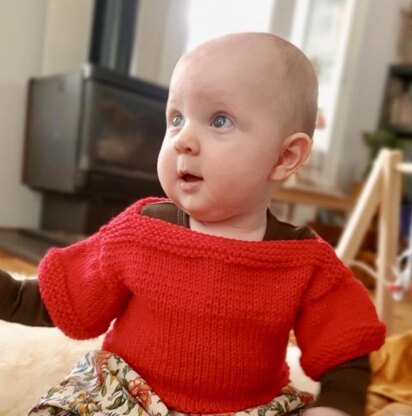 The Banksi Tee is a seamless short sleeved jumper suitable for babies from newborn to about one year . Named for my newest grandchild , Banksi , this baby jumper or tee is based on one Mum and I made for my children here in Australia . It’s been popular for my grandchildren over the last fifteen years as it’s been easy for their parents to pop it on over a onesie to provide an extra bit of warmth on chilly mornings . I’ve adapted it into a seamless pattern . The sleeves are short but probably reach to a baby’s elbow . I've substituted the yarn mentioned in the pattern for Lang Merino 120 as it's an Australian yarn .