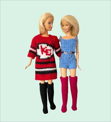 HERE IS A KNITTING PATTERN FOR 2 BARBIE / 12" DOLL OUTFITS TAYLOR SWIFT STYLE WORN TO KANSAS CITY CHIEF GAMES