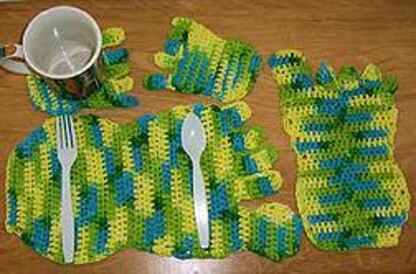 Make these up in worsted weight cotton. Pattern set includes instructions for placemat, coaster and dishcloth. As with my free pattern for a barefoot fridgie, the brighter the yarn, the better!