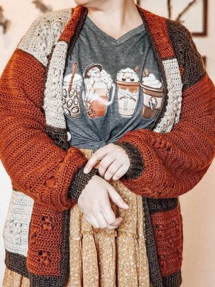 The Barley Cardigan is a straight body, oversized, drop sleeve cardigan with a v-neck. The fit will be loose and broad in the shoulders with a positive ease of 2"-6". Designed with three separate square styles that are sewn into the body of the sweater, this gives the Barley Cardigan a fun and unique patchwork look to the finished piece. The sleeves are created separately, making them easily customizable in length, and have the barley-esque stitches just above the cuffs to tie the entire piece together.