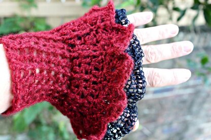 A fancy pair of cuffs suitable for a night out on the town. Gothic looking when made with red yarn that has a shiny thread through it and coupled with a black lace weight underskirt. Has a completely different look when other yarn is used.