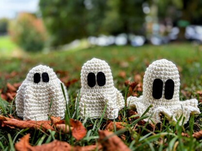 This pattern teaches you how to crochet a 4/5-inch tall ghost with three different skirt options. Includes step-by-step instructions with photos of finished product. Beginner-friendly, worked in the round with basic stitches. PDF download only.
