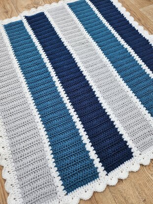 It uses DK yarn and a 4 mm hook but you can use any to suit your preference but this will alter the size of your blanket. It uses 400g in total. 100g of each colour. The finished size is 25 inches by 28 inches.