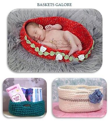 The red basket uses ribbon roses (pattern for these not included).