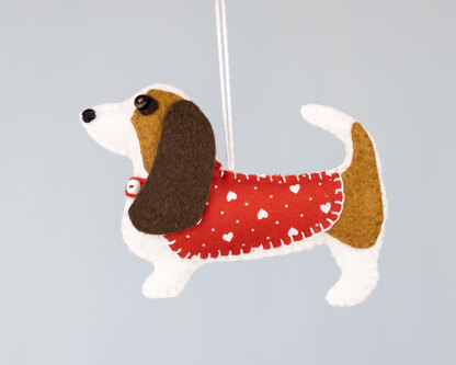 Make your own Brenda the Basset Hound felt dog ornament with this easy downloadable sewing pattern. Brenda wears a festive red and white jacket and makes a special gift for a dog lover or a cute addition to your Christmas decor. Brenda measures 5 inches / 13cm from nose to tail and has a loop for hanging. She is decorated on the front and has a plain felt back. All the stitching is done by hand. You will need small pieces of white and brown felt, patterned cotton fabric, two tiny buttons, a little filling and matching threads. The pattern includes step by step photos and instructions, with full size templates ready for you to print.