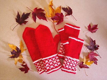 These nice, thick mittens or fingerless mitts have a stranded cuff to coordinate with the Battle Lines Hat pattern, and a plain stockinette hand for a simple, quick finish. The fingerless mitts have contrast color accents at the top of hand and thumb. Make a pair of these up in a bulky weight yarn of your choice to keep your hands warm in the coldest of weather.