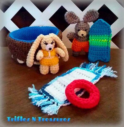 Check out these Beach Bunnies! They come in their own beach bag, that converts into a pool! Two ear and muzzle versions help you personalize your bunnies, and the swim ring, beach towel, surfboard and two swimsuit patterns are all included! Hours of fun, interactive play, that's easy to take on-the-go, and you can use up your scrap yarns to create most of it ;)