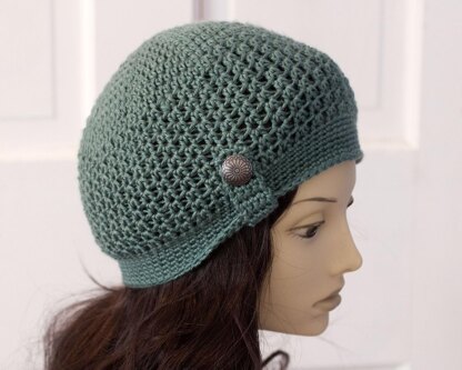 This is an easy hat pattern crocheted in the round in a pretty textured stitch and embellished with a tab button.