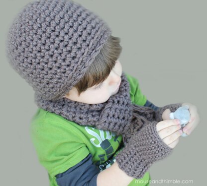 Easy to crochet. Basic 3 piece winterwear set for toddler boy or girl. Pair of fingerless gloves (quick for little hands to manage on & off themselves), bulky beanie hat and scarf made with 2 skeins of medium weight yarn.