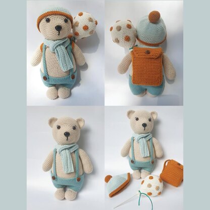 This adorable crochet bear pattern features a charming little bear dressed in suspender shorts and a cosy hat.