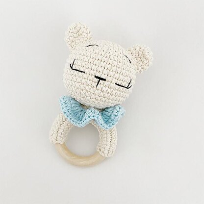 MATERIALS - 2.00 mm hook - Yarn: 2 colors (skin color, collar color) - Polyester fiberfill - Tapestry needle - Embroidery thread - Rattle - Wooden ring (60 mm outside diameter)