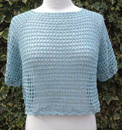 This top is crocheted from the top down so you can try it on as you go. It's mostly worked in the round, with a few rows worked back and forth to provide neck shaping.