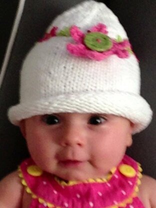 This is an easy to knit roll brim hat, with a decorative trim and fanciful knitted flower sewn on. It is knit in the round.