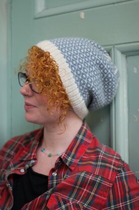A simple, effective, stranded colourwork pattern contrasts White Rose with the soft blue Aire shade in this relaxed beanie hat.